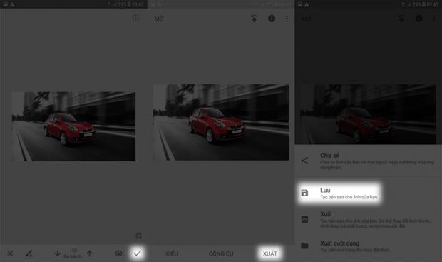 Khi bạn đã thấy hài lòng với bức ảnh của mình, hãy nhấn vào dấu tích phía dưới rồi chọn Xuất và cuối cùng là chọn Lưu để lưu lại bức ảnh.