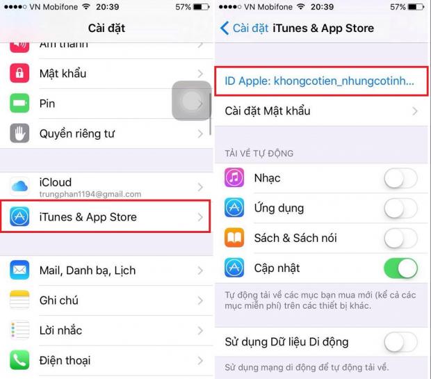 Trước tiên, bạn vào phần Cài đặt > iTunes & App Store và kiểm tra xem tài khoản có phải là của bạn không. Nếu không phải, bạn nhấn vào tài khoản đó, chọn Đăng xuất và nhập tài khoản của bạn vào.