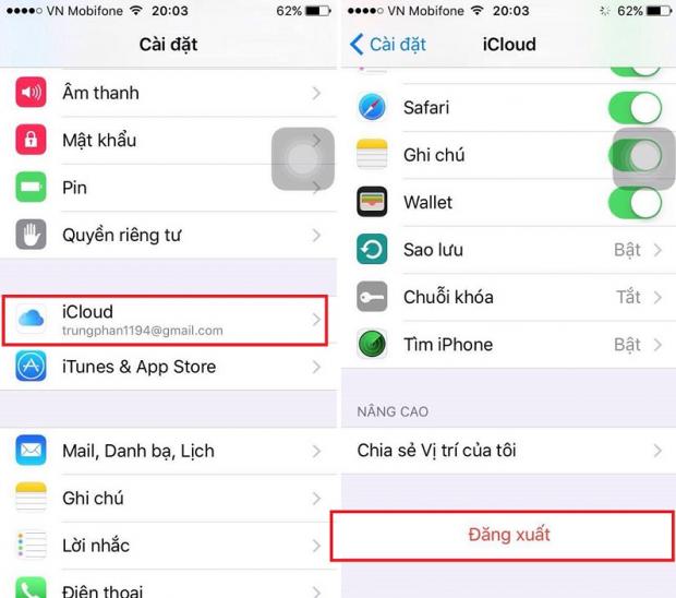 - Thoát tài khoản iCloud (nếu có) trên máy bằng cách vào Cài đặt > iCloud > Đăng xuất.