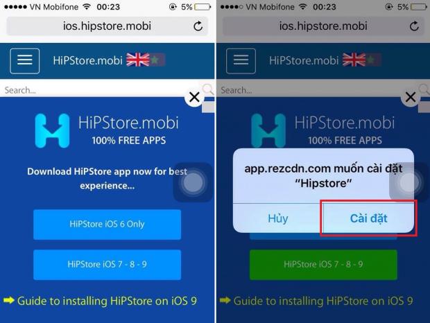 Bước 1: Các bạn vào trình duyệt Safari và truy cập trang: HipstoreBước 2: Lựa chọn phiên bản iOS hiện tại của máy > Cài đặt > Quay trở lại màn hình chính bạn sẽ thấy biểu tượng Hip4U đang được tải về.