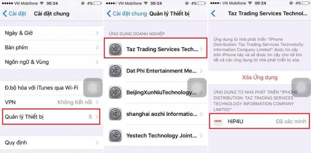 Bước 3: Các bạn cần xác minh ứng dụng này bằng cách vào Cài đặt > Quản lý thiết bị > Taz....> chọn Hip4U bấm Xác minh.