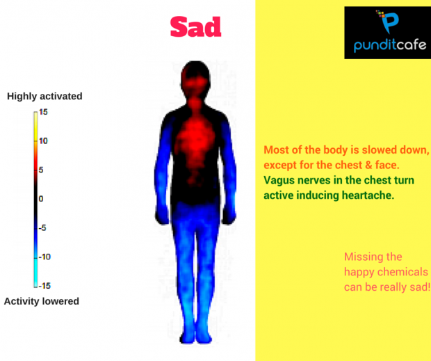 Khi buồn bã, đa phần các khu vực trong cơ thể đều chậm chạp, ngoại trừ phần ngực và khuôn mặt. Sở dĩ phần ngực có màu đỏ là do tác động của dây thần kinh phế vị. Đây là dây thực vật phó giao cảm (thuộc hệ thần kinh thực vật) lớn nhất của cơ thể, chi phối vận động, cảm giác hầu hết các phủ tạng ở ngực và ổ bụng (bao gồm tim, phổi, tiêu hóa, tiết niệu và sinh dục).
