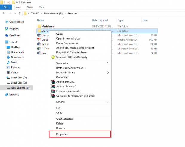 Kích chuột phải vào thư mục mà bạn muốn chia sẻ, sau đó click chọn Properties.