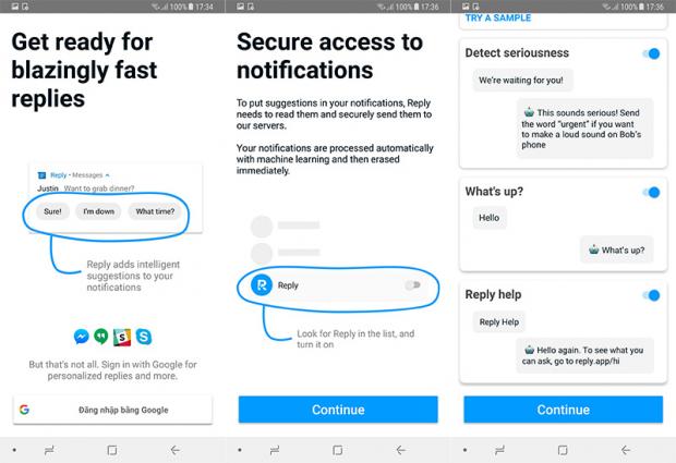 Đây là một ứng dụng được phát triển từ tính năng Smart Reply do Google phát triển dành riêng cho các ứng dụng nằm trong hệ sinh thái như Gmail, Inbox, Allo và Android Messenger của người dùng dịch vụ Project Fi. Về cơ bản thì Reply sử dụng trí tuệ nhân tạo để quét nội dung văn bản gửi đến từ WhatsApp, Facebook Messenger, Twitter Messenger hay bất kỳ ứng dụng trò chuyện trực tuyến nào khác, sau đó đưa ra lựa chọn gợi ý (hoặc phản ứng) tùy theo ngữ cảnh, giúp người dùng trả lời tin nhắn một cách nhanh chóng và chính xác nhất.Bạn có thể áp dụng tính năng hữu ích của Reply trong nhiều trường hợp khác nhau như trả lời trực tiếp từ ứng dụng, hồi đáp nhanh qua trung tâm thông báo khi đang di chuyển hoặc không tiện sử dụng điện thoại v.v...