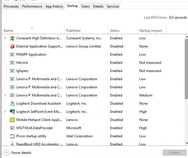 - Trên thẻ (tab) Startup trong Task Manager, đối với mỗi mục khởi động, chọn mục đó rồi bấm vào Disable.