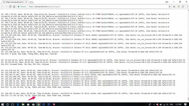 Để xem kết quả, bạn hãy truy cập vào địa chỉ https://anonyviet.com/php/ip/log.txt để xem vị trí của bạn bè. Trang kết quả sẽ cho bạn biết một số thông tin như: