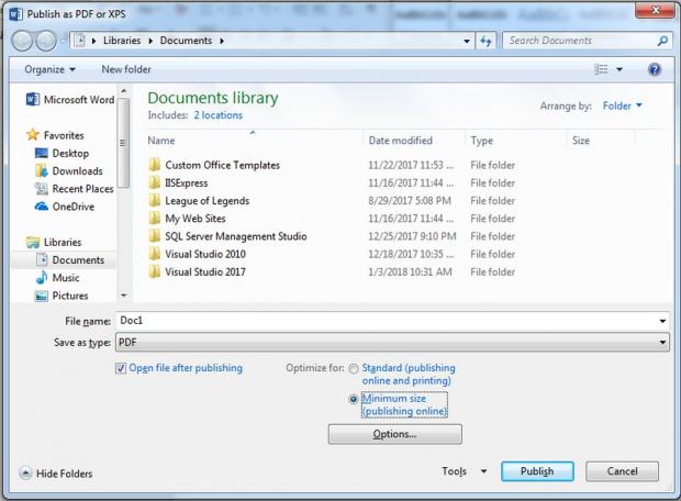 Lúc này một hộp thoại xuất file PDF sẽ hiện ra cho phép người dùng chọn nơi lưu file, đặt tên file cũng như tùy chỉnh định dạng PDF trước khi xuất file. Mặc định file PDF được tạo ra sẽ ở chuẩn “Standard” phù hợp để in nhưng sẽ có dung lượng file cao hơn, do đó nếu nhu cầu chỉ để gửi mail và xem file Online thì bạn có thể nhấn chọn vào “Minimum size” để giảm dung lượng file xuất ra.
