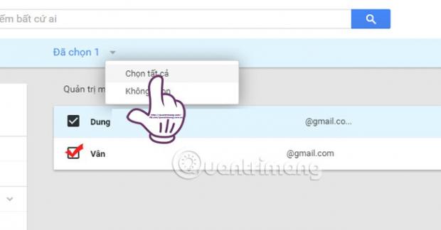 Để tiến hành gửi email cho nhóm, bạn tích chọn vào các liên lạc đó nếu muốn gửi mail cho hai hoặc ba địa chỉ lên hệ trong nhóm. Còn nếu muốn gửi cho tất cả địa chỉ lên lạc trong nhóm, nhấn Chọn tất cả (All) trong mục Đã chọn (Selected).