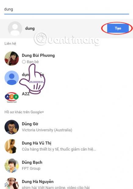 Sau đó sẽ xuất hiện danh sách liên hệ. Bạn nhập tên người cần thêm và sau đó tích chọn tên tài khoản để thêm vào nhóm. Ngoài ra, nếu bạn muốn thêm người vào nhóm mà chưa có trong dach sách liên hệ thì nhấn Tạo.