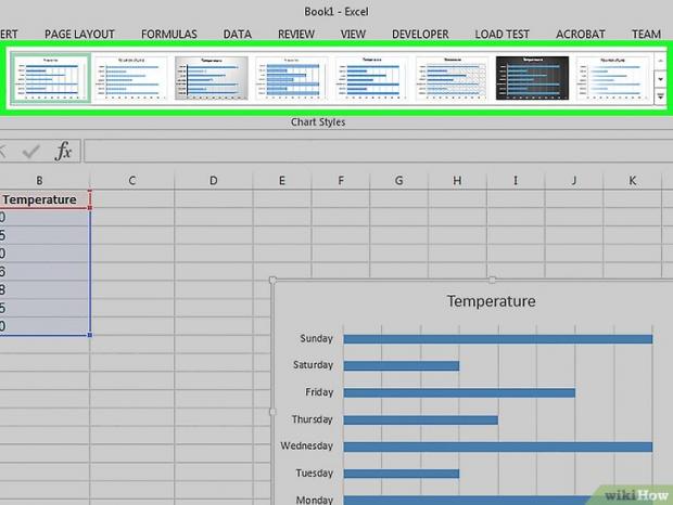Tùy chỉnh biểu đồ. Khi bạn quyết định định dạng đồ thị, bạn có thể sử dụng phần 'Thiết kế' (Design) ở gần phía trên cùng của cửa sổ Excel để chọn mẫu khác, thay đổi màu sắc, hoặc thay đổi hoàn toàn loại biểu đồ.