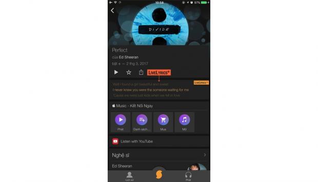 Lúc này ứng dụng SoundHound sẽ quét, tìm bài hát đang được phát là gì và hiển thị tên bài hát, lời nhạc ngay khi tìm thấy. Người dùng chỉ việc nhấn vào chữ LiveLyrics để xem lời bài hát.