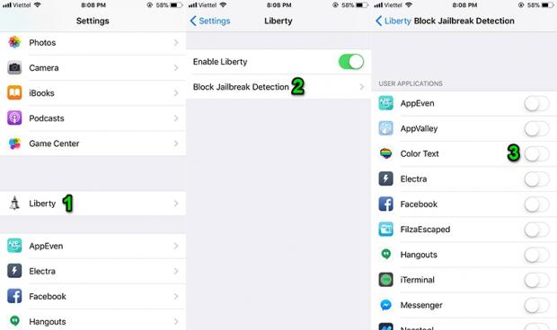 Bước 3: Sau khi cài quá trình cài đặt tweak hoàn tất, bạn truy cập vào 'Cài đặt' và tìm ứng dụng 'Liberty Lite'. Trong phần cá nhân hóa, bạn cần đảm bảo rằng đã kích hoạt nút 'Enable' và thiết lập 'block jailbreak detection' (lựa chọn danh sách ứng dụng cần chặn quét jailbreak)