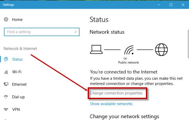 Giao diện quản lý phần Internet đã được phẳng hóa thay vì chức năng cũ, ba jclick vào CHange Connections propeties để vào phần quản lý DNS và đổi IP