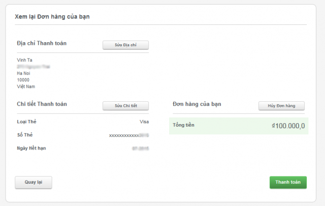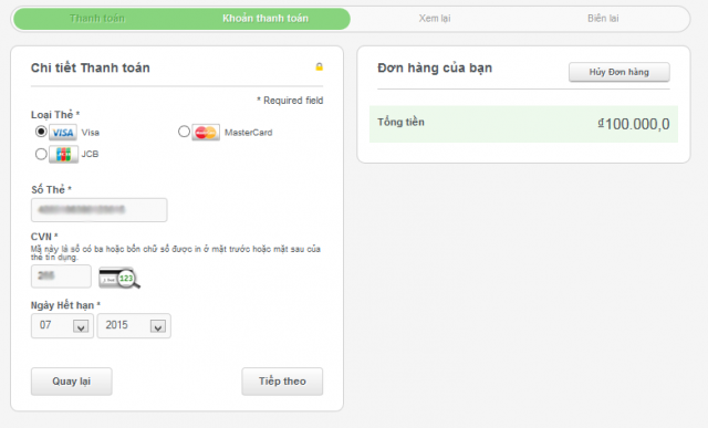 B5 : Nhập thông tin thẻ tín dụng. Ở đây các bạn có 3 lựa chọn thanh toán qua Visa, Master Card và JCB.