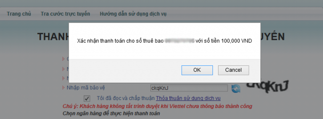 Sau khi bạn nhấn nút 'Thanh toán' thì hệ thống sẽ tự động trừ tiền của bạn trong ngân hàng và hiển thị thông báo 'Thanh toán thành công'. Vậy là bạn đã thanh toán cho số thuê bao Viettel của mình cứ 100.000đ bạn sẽ được cộng 50 phút gọi nội mạng tương đương với 50.000 đ.