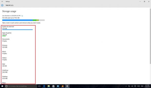 5. Trên giao diện Storage usage, bạn sẽ nhìn thấy Windows 10 phân loại nội dung dựa trên thư mục mặc định (ví dụ như tài liệu văn bản, hình ảnh, bài hát...), ứng dụng và trò chơi và các file hệ thống. Để xem thêm chi tiết các thông tin khác, bạn click vào tên từng thư mục đó.