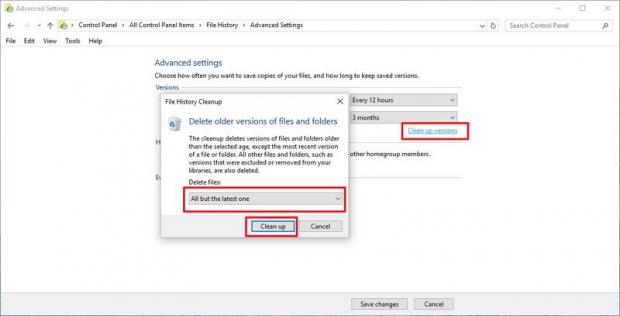 6. Trên cửa sổ công cụ File History Cleanup, chọn phiên bản file mà bạn muốn xóa từ menu Dropdown. Chẳng hạn bạn có thể chọn tùy chọn All but the latest one.