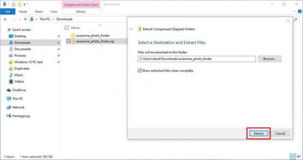 2. Sau khi tải xong ứng dụng Duplicate Photo Finder, kích chuột phải vào thư mục Zip và chọn Extract all.