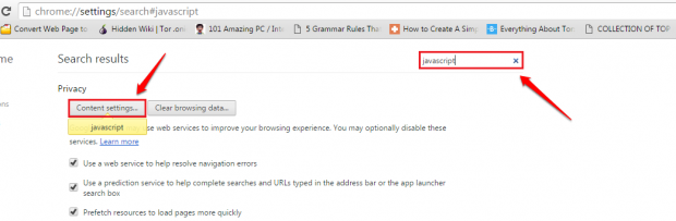 Tiếp theo nhập jаvascript vào khung search trên cửa sổ Settings như hình dưới đây. Lúc này Google Chrome sẽ hiển thị mục có tên Privacy. Tại đây bạn click chọn Content Settings.