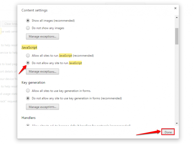 Trên cửa sổ tiếp theo, bạn click chọn tùy chọn Do not allow any site to run jаvascript, sau đó click chọn Done ở góc dưới cùng cửa sổ là xong.
