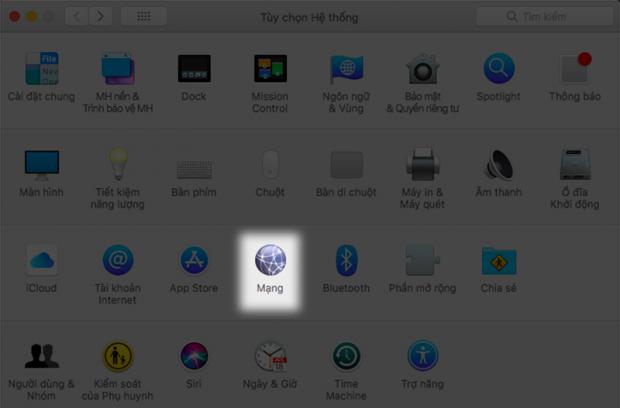 Để có thể thay đổi DNS trên hệ điều hành MacOS, người dùng có thể truy cập Tuỳ chọn hệ thống, sau đó chọn tuỳ chọn Mạng.