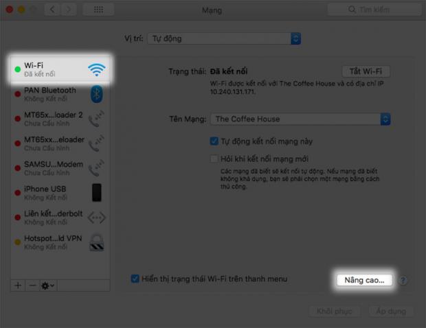 Tại đây chọn đúng thiết lập mạng Wi-Fi, sau đó chọn tiếp nút Nâng cao ở góc phải màn hình.