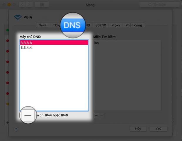 Hộp thoại chứa các tuỳ chọn Nâng cao sẽ hiển thị, chuyển sang tab DNS. Nếu ở khung Máy chủ DNS đang chứa các máy chủ DNS khác thì bạn có thể chọn và nhấn vào biểu tượng - để gỡ bỏ.