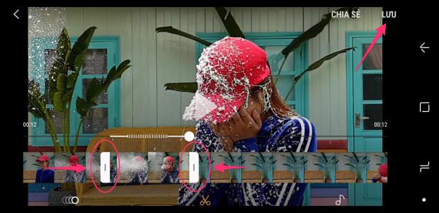 Khi bấm xem đoạn clip vừa quay, giao diện chỉnh sửa cũng sẽ tự động hiện ra, muốn cắt crop bạn chọn hình cây kéo ở giữa bên dưới nhé, sau đó di chuyển hai cột như hình trên để lấy đoạn nào muốn và bỏ đoạn nào không muốn. Chỉ cần di chuyển qua lại, cực kỳ đơn giản.