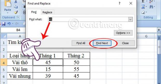 Ngay sau đó xuất hiện giao diện hộp thoại Find and Replace. Tại đây, bạn sẽ nhập từ hoặc số liệu cần tìm kiếm vào ô Find What. Chẳng hạn, tôi muốn tìm vị trí của con số 45.