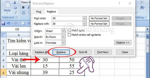 Theo như trong hình, tôi chọn Replace để thay thế lần lượt 2 vị trí số 45 trong bảng tại B4 và C6. Tại vị trí B4 đã thay 45 sang 30. Còn với vị trí C6, tôi đổi giá trị 45 sang 25.