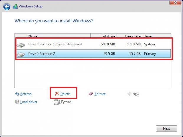 6. Chọn và xóa các phân vùng hệ thống. Thông thường bạn tìm và xóa Drive 0 Partition 1 và Drive 0 Partition 2.