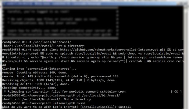 sudo git clone https://github.com/rehmatworks/serverpilot-letsencrypt.git && cd serverpilot-letsencrypt && sudo mv sple.sh /usr/local/bin/rwssl && sudo chmod +x /usr/local/bin/rwssl && (crontab -l ; echo "@monthly \"sudo service nginx-sp stop && yes | letsencrypt --standalone renew &>/dev/null && service nginx-sp start && service nginx-sp reload\"")| crontab - && service cron reload