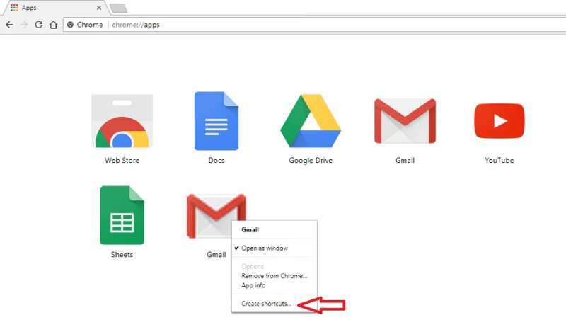 Bước 2: Chuột phải vào ứng dụng Gmail và chọn Create shortcuts