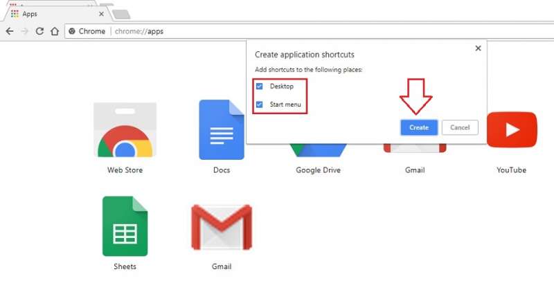 Bước 3: Chọn vị trí xuất hiện của shortcuts, bạn có thể chọn shortcuts gmail ở giao diện desktop hoặc start menu tùy theo nhu cầu.