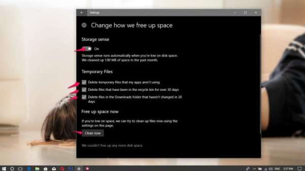 - Delete files that have been in the recycle bin for over 30 days: Bất kỳ tập tin trong thùng rác sẽ được tự động làm sạch nếu nó vẫn còn ở đó sau 30 ngày. Hãy nhớ rằng nếu bạn xóa một tập tin bằng cách nhấn phím Delete trên bàn phím thì nó sẽ nằm trong Recycle Bin và tiếp tục chiếm dung lượng lưu trữ cho đến khi bạn xóa thêm lần nữa.