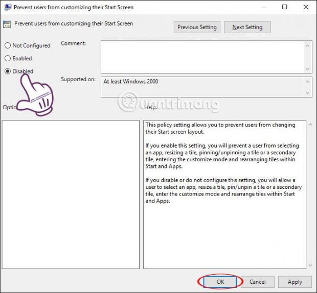 Ngay sau đó xuất hiện giao diện hộp thoại Prevent users from customizing their Start Screen. Chúng ta sẽ nhấn chọn Disabled rồi bấm OK để lưu lại thay đổi.