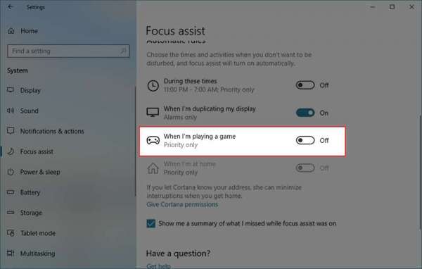 Bước 7: Đây là thiết lập quan trọng tiếp theo giúp loại bỏ 'lỗi' màn hình đen khi game thủ nhấn ALT + Tab để chuyển cửa sổ. Tại thẻ System (trong menu Settings) > Chọn vào mục Focus assist > Tắt (OFF) tính năng When I'm playing a game.