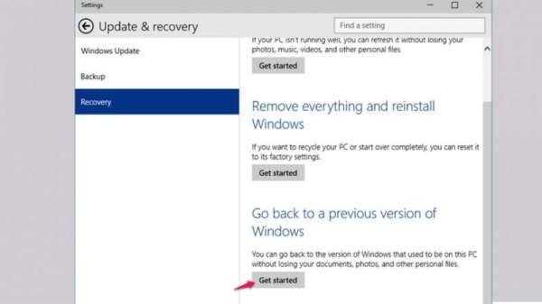 Bước 2: Chọn tab Recovery, click Get started ở dưới mục Go back to the previous version of Windows 10.