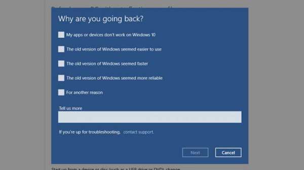 Bước 3: Chọn một lý do bạn muốn quay lại phiên bản Windows cũ, sau đó click Next.