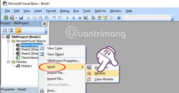 Xuất hiện giao diện cửa sổ mới Microsoft Visual Basic. Tùy theo nội dung mà bạn đang làm việc ở sheet 1, sheet 2 hoặc sheet 3,.. mà chúng ta click chuột phải vào Sheet chọn Insert rồi Module. Tại đây, tôi sẽ chọn làm việc với sheet 1.
