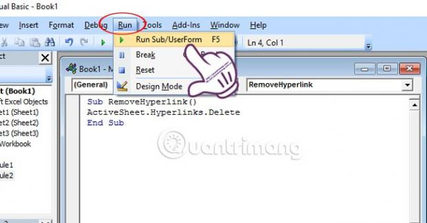 Cũng tại giao diện đó, bạn nhấp chọn mục Run Sub/User Form hoặc phím F5 để chương trình thực hiện xóa các link liên kết trong bài.