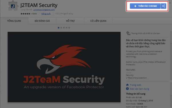 Bước 2: Nhấn vào biểu tượng 'THÊM VÀO CHROME' để cài đặt tiện ích J2TeaM Security vào trình duyệt.