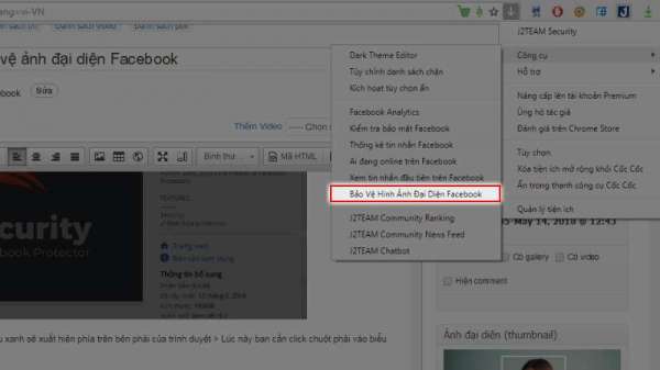 Bước 3: Sau khi cài đặt hoàn tất, một biểu tượng chữ 'J' màu xanh sẽ xuất hiện phía trên bên phải của trình duyệt > Lúc này bạn cần click chuột phải vào biểu tượng 'J' > Công cụ > Bảo vệ hình ảnh đại diện Facebook.