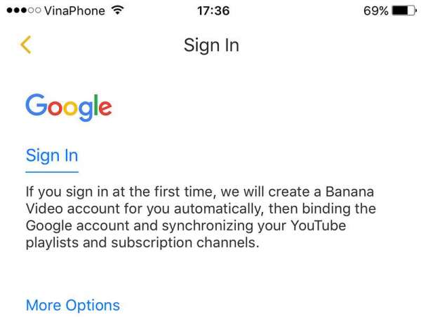 Để tải về video hoặc sử dụng một số chức năng khác như đồng bộ dữ liệu, quản lý danh sách phát từ YouTube gốc v.v... bạn cần đăng nhập tài khoản Google cho BananaVideo.