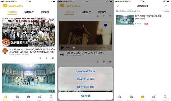 Sau đó nhấn vào biểu tượng mũi tên phía dưới ảnh mô tả của video để tiến hành tải về. Có ba lựa chọn chính là tải dưới dạng file âm thanh, tải chất lượng SD hoặc HD. Lưu ý, nội dung tải về được lưu trực tiếp trong ứng dụng BananaVideo và chư hỗ trợ chuyển tiếp về bộ nhớ máy nhé!