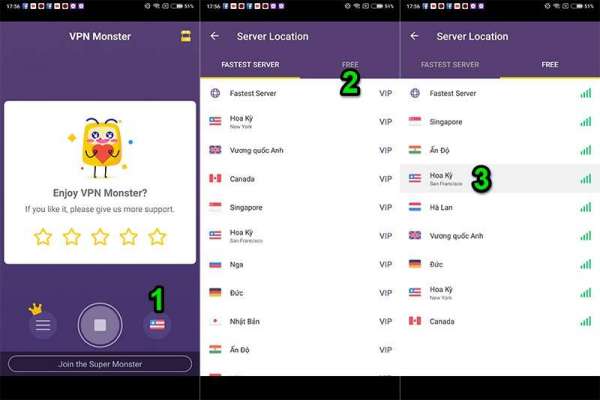 Bước 4: Mở ứng dụng VPN đã tải về (mình dùng VPN Monster để thực hiện bài viết này), chọn kết nối từ quốc gia trong danh sách hỗ trợ của YouTube (bao gồm Mỹ, Mexico, Úc, New Zealand, Hàn Quốc v.v...)
