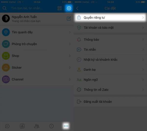 Đầu tiên, bạn hãy chuyển sang tab cuối cùng với biểu tượng dấu ba chấm rồi chọn biểu tượng Cài đặt hình bánh răng. Sau đó chúng ta hãy chọn phần Quyền riêng tư.