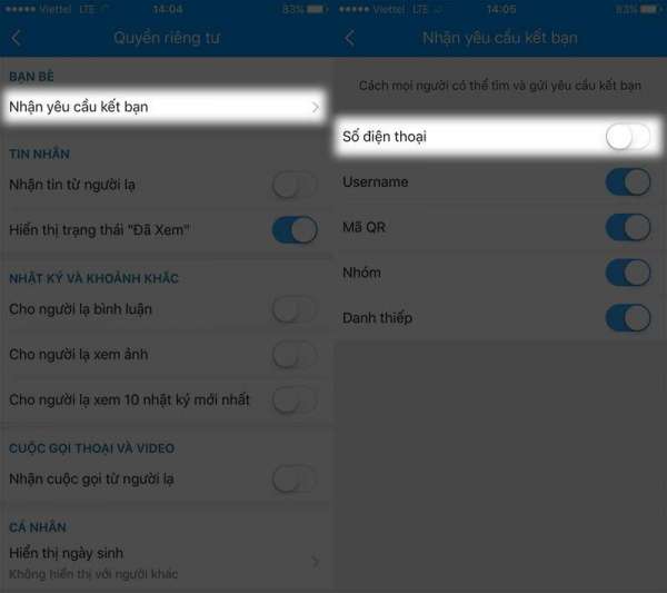 Tiếp theo, bạn hãy chọn phần Nhận yêu cầu kết bạn và gạt để tắt phần Số điện thoại là xong.