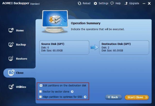 Là phần mềm sao lưu và khôi phục miễn phí, AOMEI Backupper Standard chứa tất cả những thứ bạn cần. Nó có thể nhân bản ổ cứng sang SSD, thậm chí còn giảm dung lượng nhỏ hơn. Ngoài ra, nó còn có khả năng chỉnh sửa các phân vùng trên ổ đích. Bạn không cần phải lo sợ vấn đề SSD không hợp HDD.
