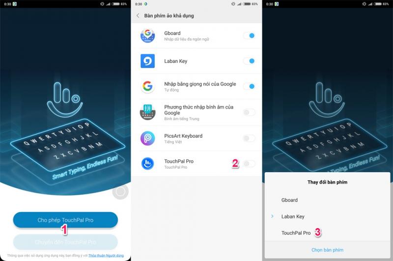 - Tải về TouchPal Keyboard Pro và mở ứng dụng trên màn hình chính > Nhấn nút Cho phép Keyboard Pro và kích hoạt thay thế cho bàn phím mặc định (hoặc thực hiện thủ công trong mục Ngôn ngữ & Cài đặt) > Chọn 'Chuyển sang TouchPal Keyboard Pro' và cấp quyền truy cập tin nhắn SMS và danh bạ